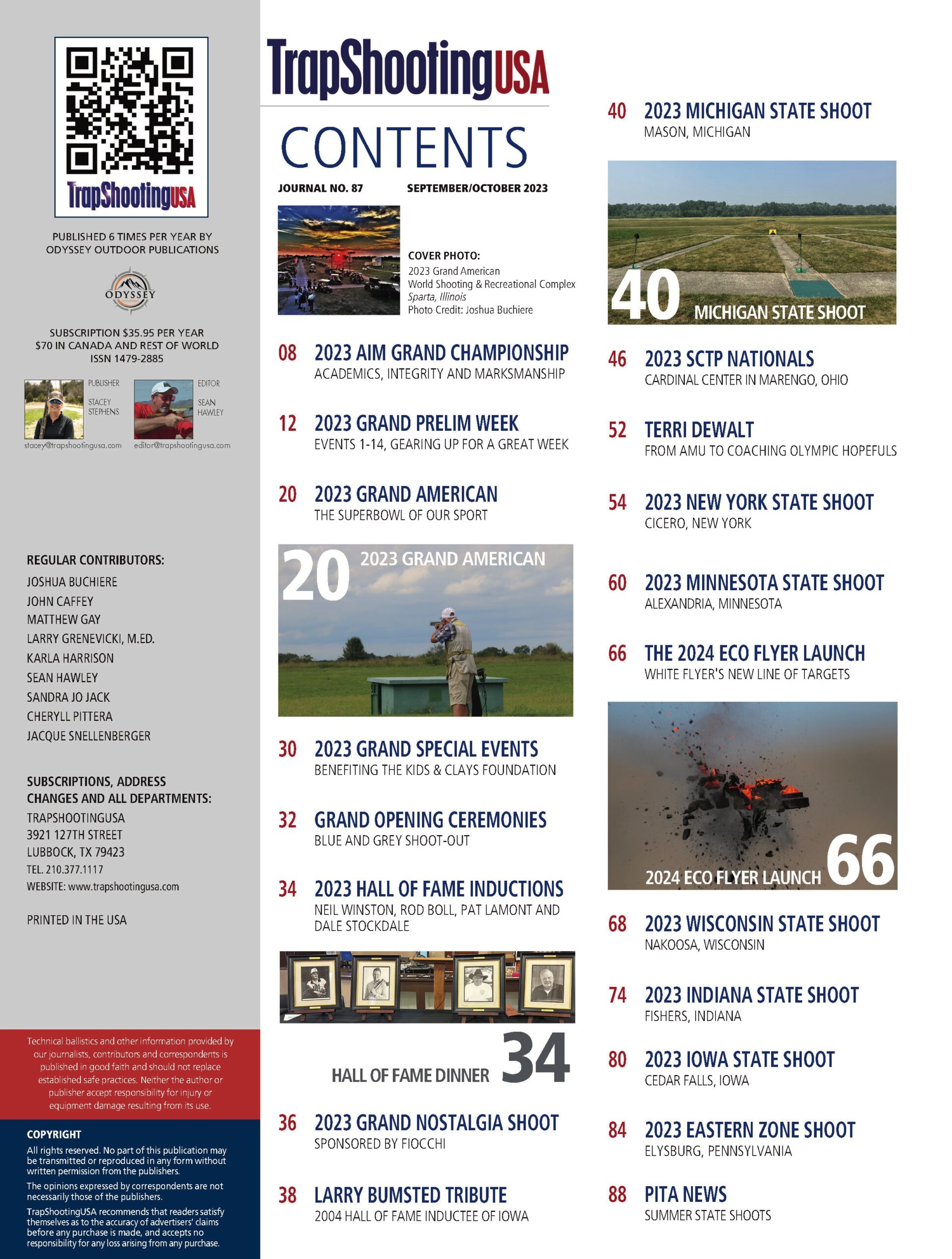 The Grand American is always the “Super Bowl of Trapshooting,” and our September/October 2023 issue brings you right into the middle of all the action from Sparta, Illinois. From the AIM Championships to the final shootoffs, this edition captures the full sweep of the sport’s biggest stage.